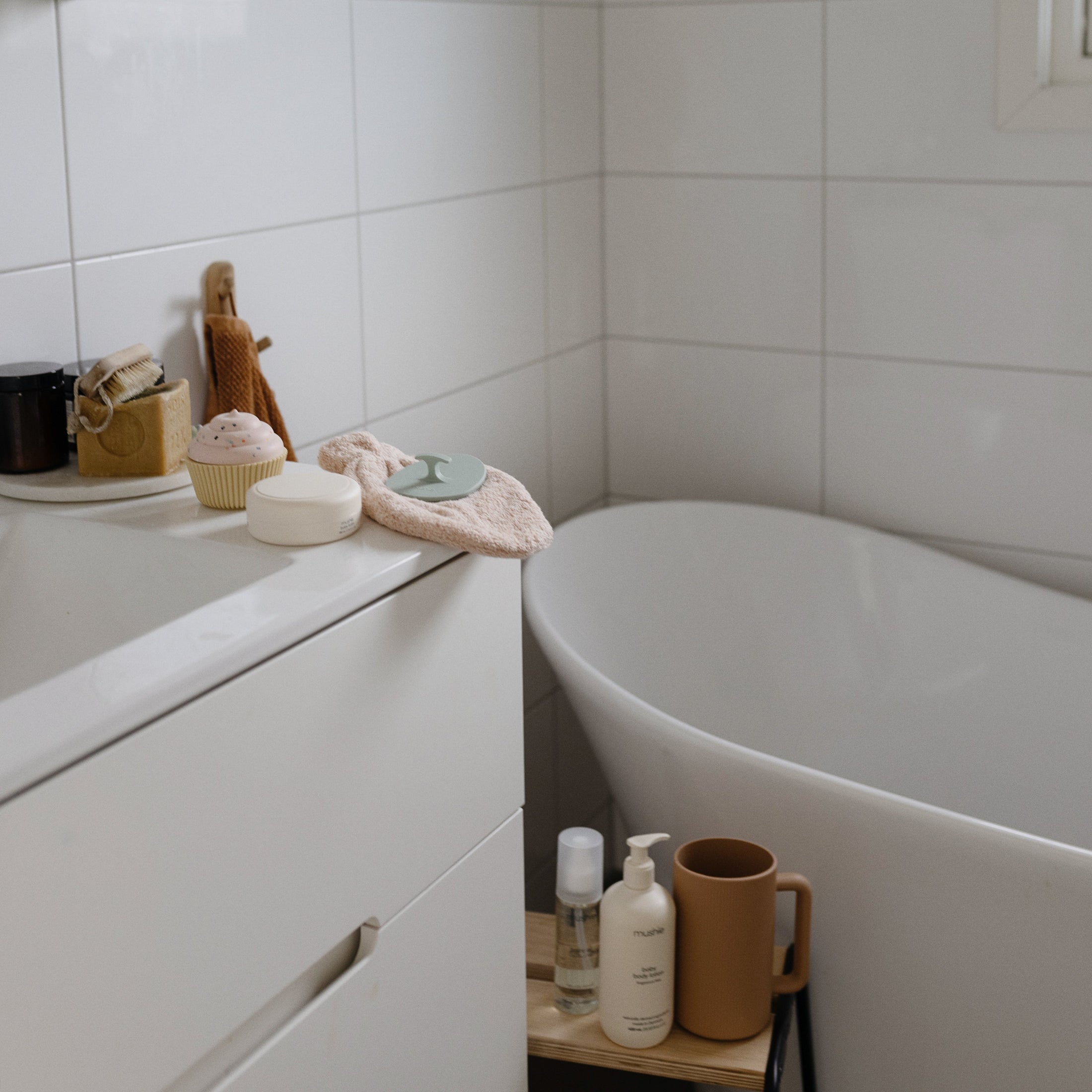 To use: Apply cleanser and gently brush in a circular motion during bath time. Clean with warm, soapy water and let air dry after each use.