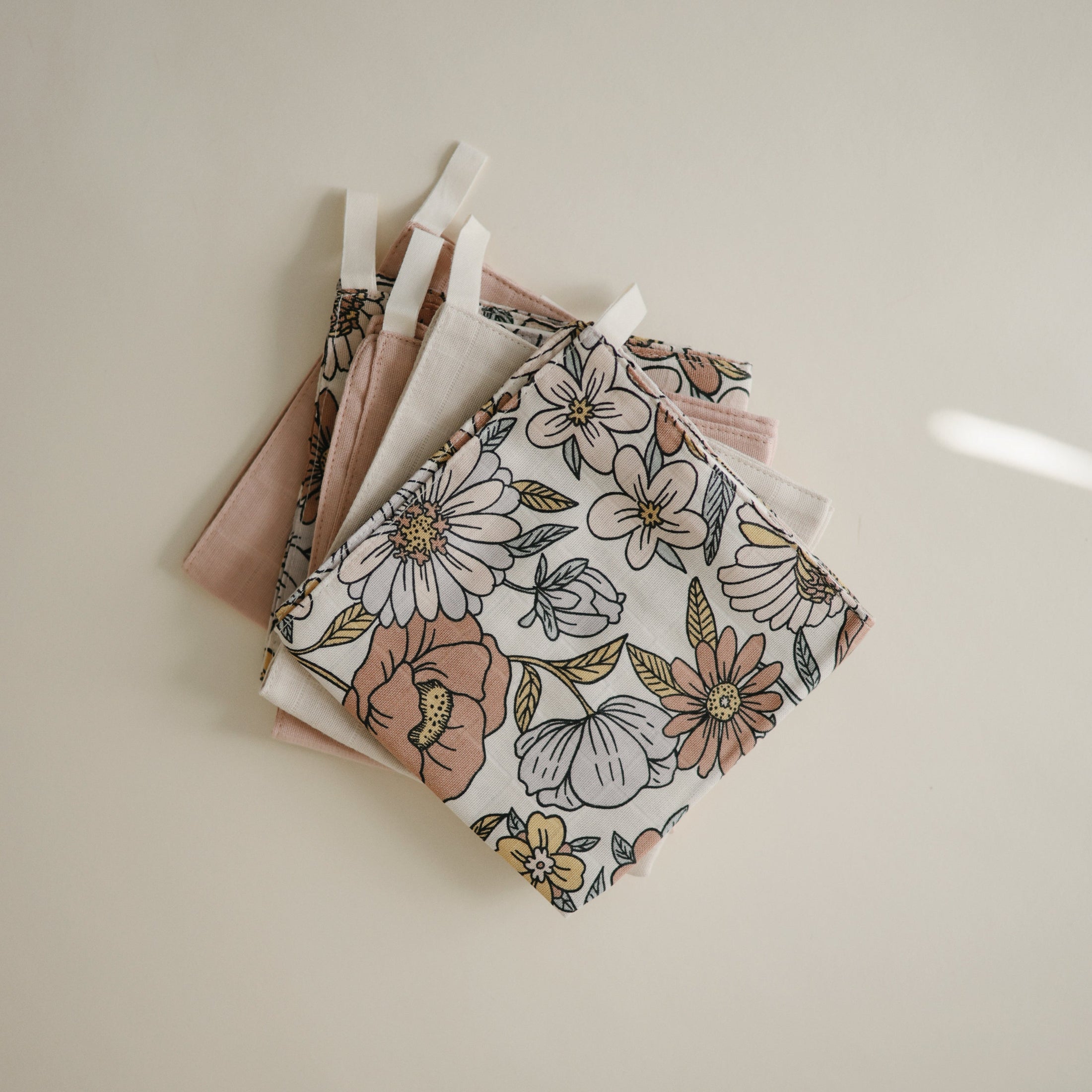 Made of soft 100% organic cotton, our muslin washcloths are essential for cleansing delicate skin during bath time, wiping up messes during meal time, and any time in between. Measuring 11 x 11 inches, they are the perfect size for bathing and easily fit in a diaper bag for on-the-go cleanups. Each cloth has a small cotton loop for convenient hanging and drying after use. The muslin material is gentle on baby’s skin and durable enough for machine washing and everyday use.