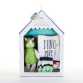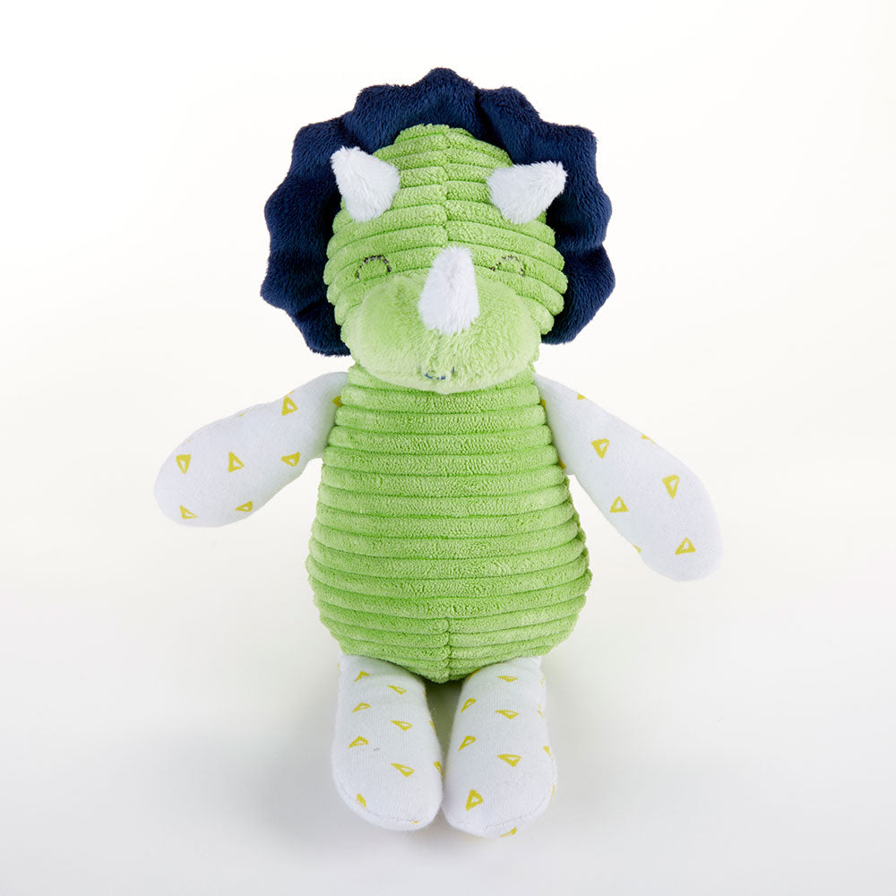 - Green velour rattle plush with dino body and interlock print limbs. Interlock bib with embroidery. Blanket is lovie sized crafted from velour and satin with a fun multi-colored dino print. Dinosaur character print socks. Dinosaur print hat crafted from cotton interlock.