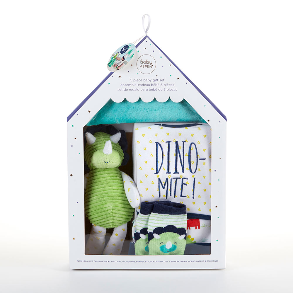 Packed full of adorable welcome home gifts, Baby Aspen's Dino Baby 5-Piece Welcome Home Gift Set includes a triceratops rattle plush, a bib, a blanket, a pair of socks, and a hat for your new little dinosaur! The set comes packaged in a house shaped gift box with a PVC window that allows you to get a glimpse at the contents inside. The gift set is geared towards little ones aged 0 to 6 months, making it the perfect baby shower gift Mom and Dad can use when welcoming their new addition home!