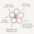 Inspired by nature and designed with functionality and comfort in mind, our silicone Daisy Rattle Teether features a playful flower shape and built-in rattle. The cheerful sound engages baby’s auditory senses for added soothing relief. With handles that are easy for small hands to grasp and a textured silicone surface that massages gums, our rattle teethers are perfect for your little one’s teething journey.