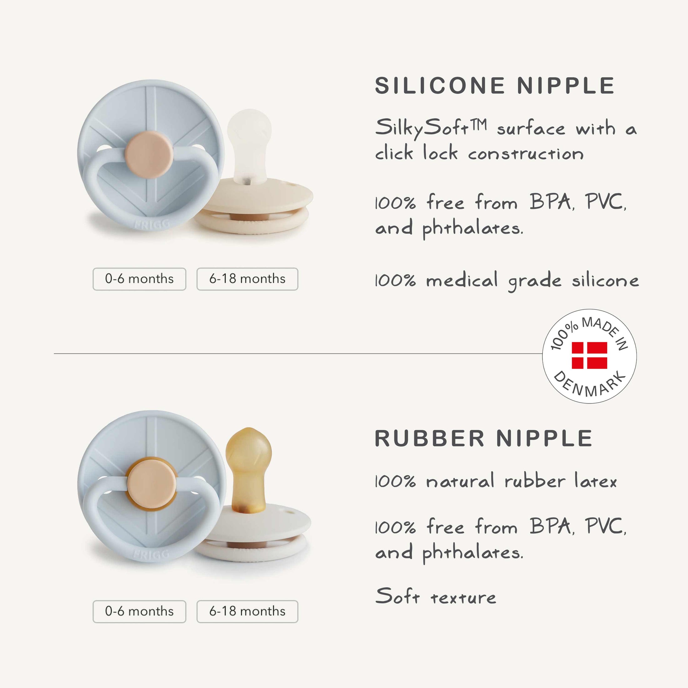 The FRIGG line of Little Viking natural latex rubber pacifiers is inspired by Norse mythology, including the Norse Goddess Frigg who is the inspiration behind the FRIGG brand. The outward curve keeps the pacifier off their delicate skin, while features like air holes and a security handle ensure your baby stays safe. Available in a range of soft colors, FRIGG pacifiers make a beautiful addition to your collection of baby essentials.