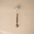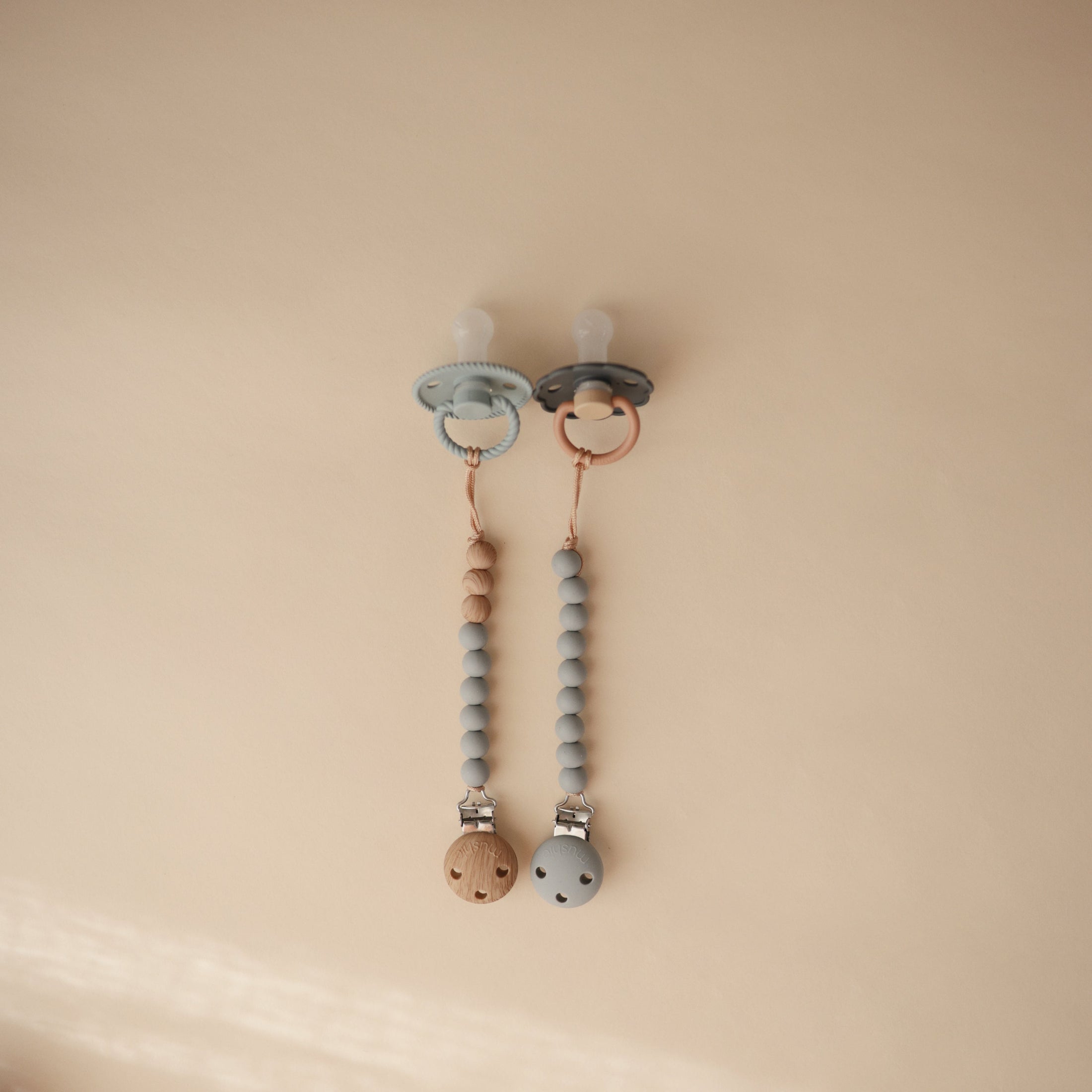 The Mushie silicone pacifier clip offers durability, function and simplicity to families on-the-go. Made from 100% food-grade silicone, our clip features a faux wood silicone clasp that brings a modern take to a traditional favorite. With a simple stack of silicone beads in two complementary colors, the Eva clip offers a sophisticated touch to your pacifier accessories. The clip is easy to clean and helps keep soothing items in reach for little ones.